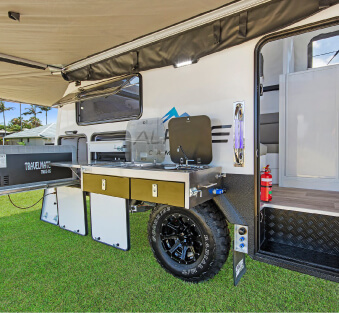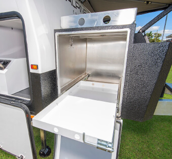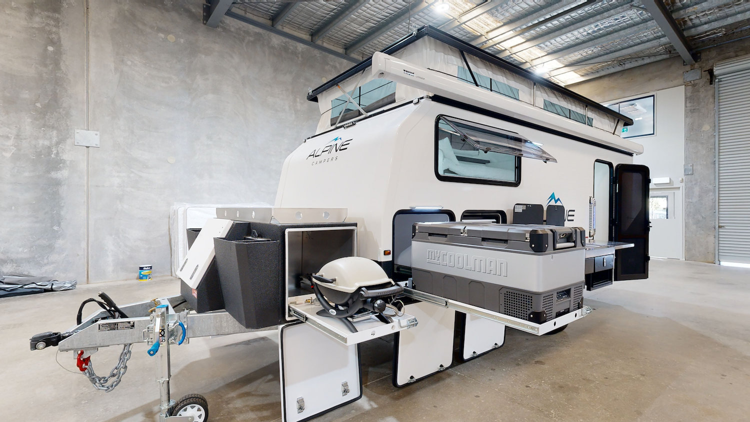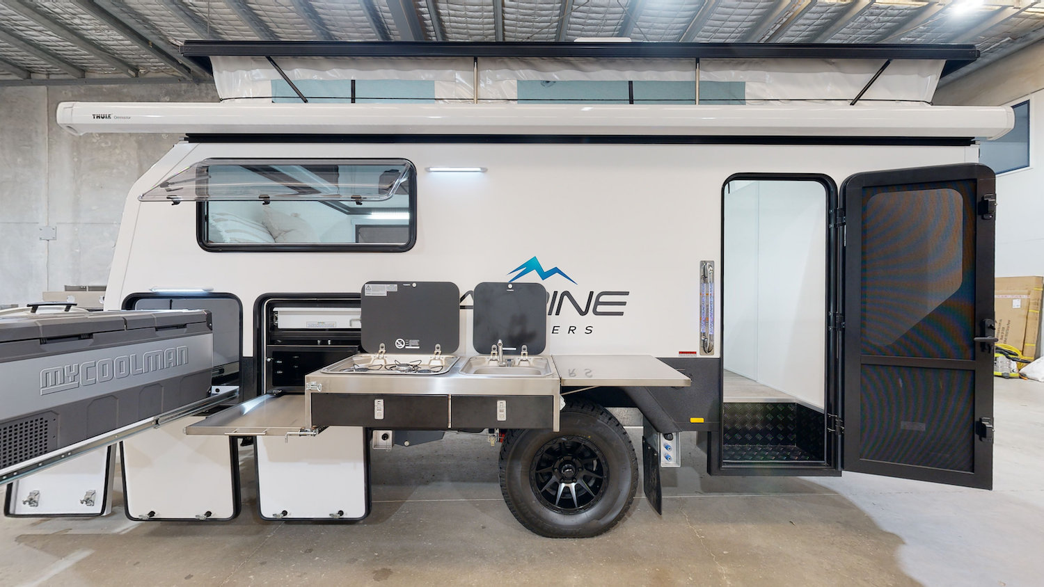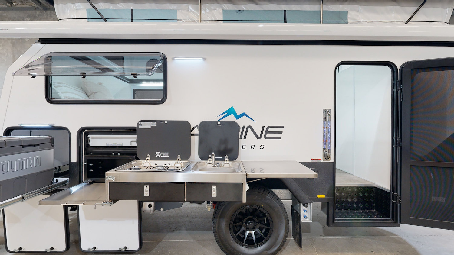 The ALP-16 redefines outdoor culinary experiences with its premium external stainless kitchen, featuring a three-burner stove, sink, and an extended bench. Including a convenient pull-out pantry and a sizeable fridge slide, all comfortably sheltered under a 5m wind-out awning.