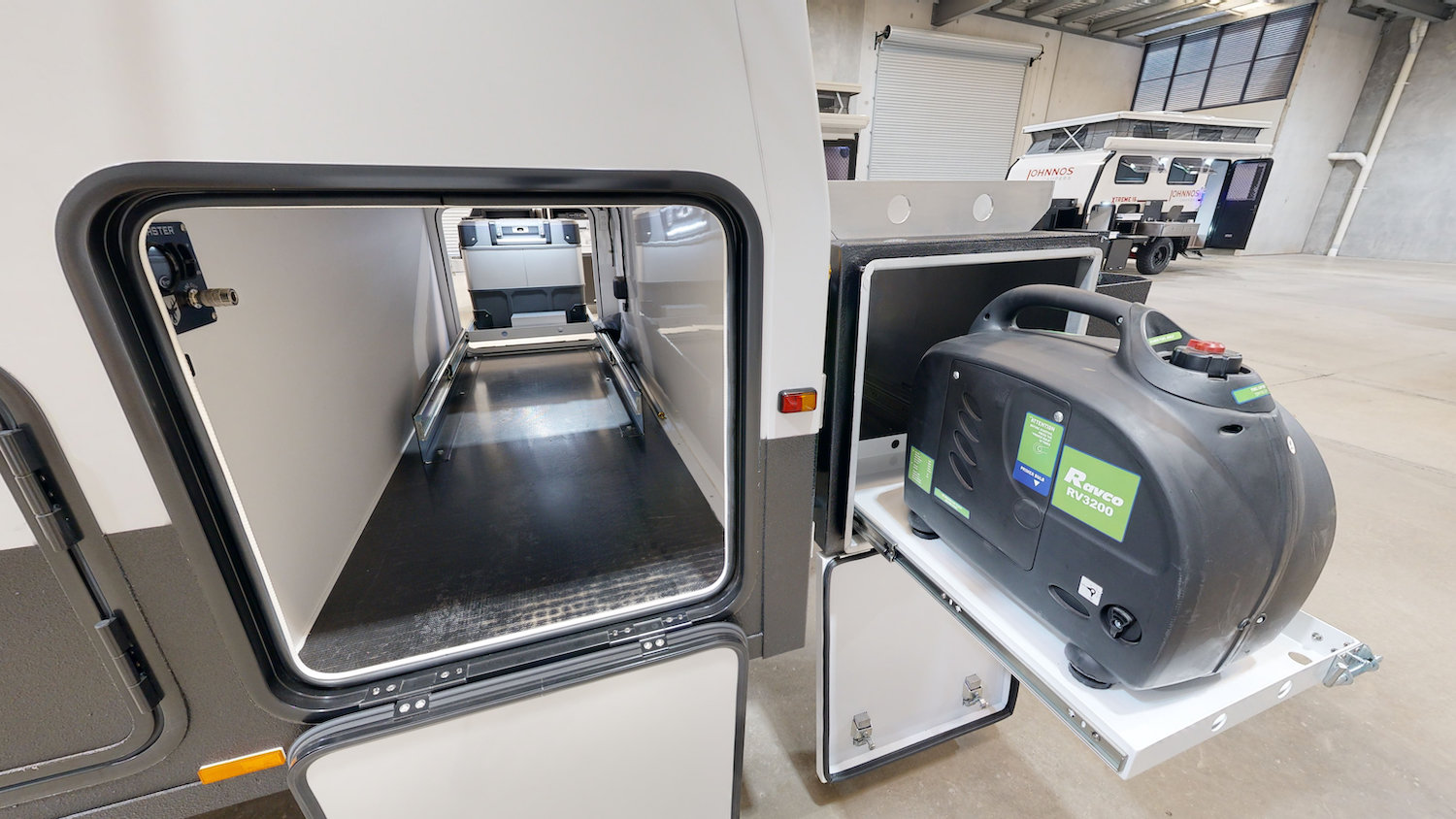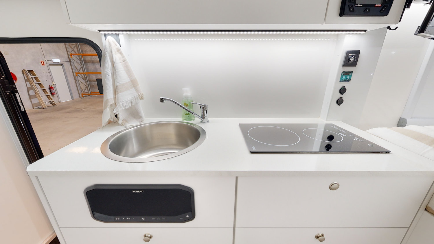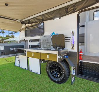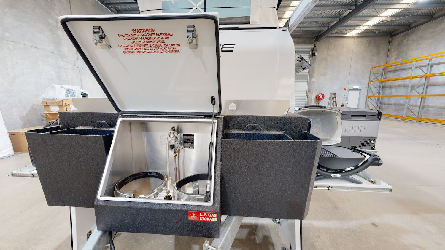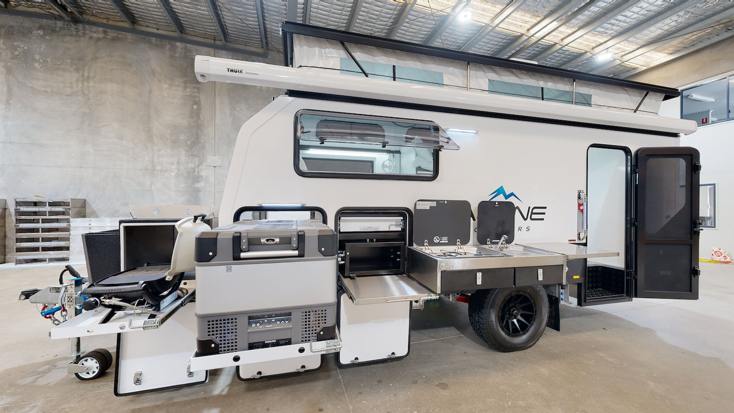 The ALP-16 redefines outdoor culinary experiences with its premium external stainless kitchen, featuring a three-burner stove, sink, and an extended bench. Including a convenient pull-out pantry and a sizeable fridge slide, all comfortably sheltered under a 5m wind-out awning.