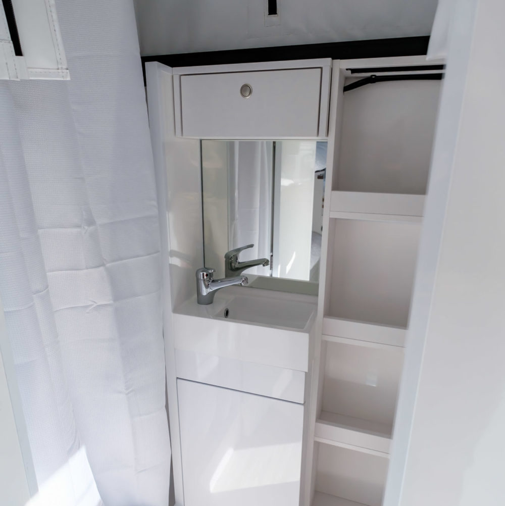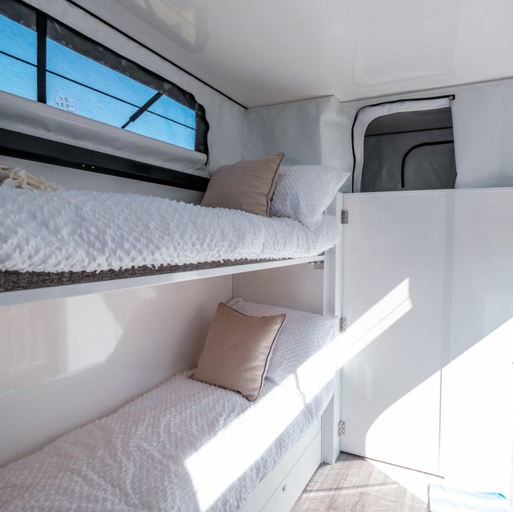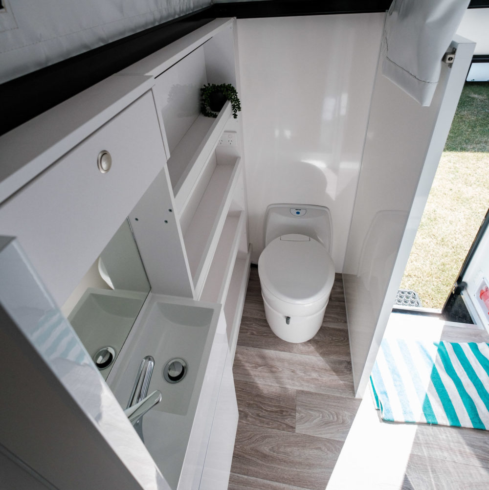 The body consists of a durable one-piece resin floor and structural foam panels, both with a fibreglass skin for added strength and insulation. Add to that the comfort of an innerspring pillow-top queen mattress, the choice of a generous cafe style seating area with table or 2 spacious bunks, an internal sink with hot/cold mixer, seperate toilet/shower and plenty of storage. All combined with a spacious layout, plenty of natural light and a clean and airy design.